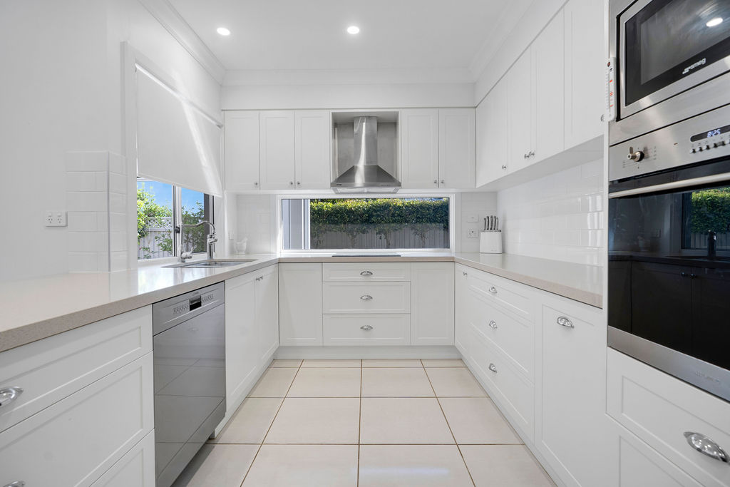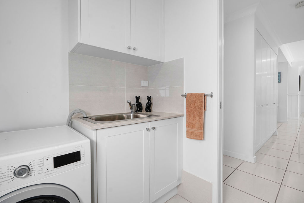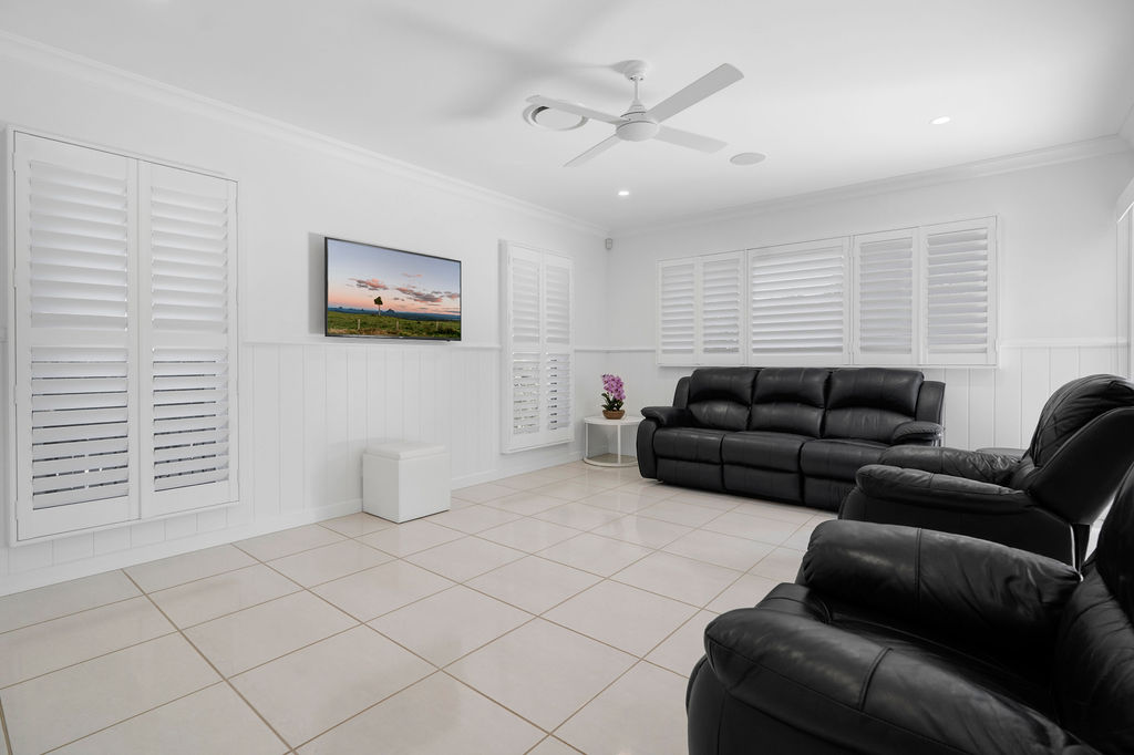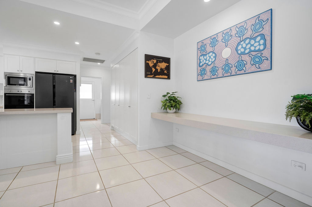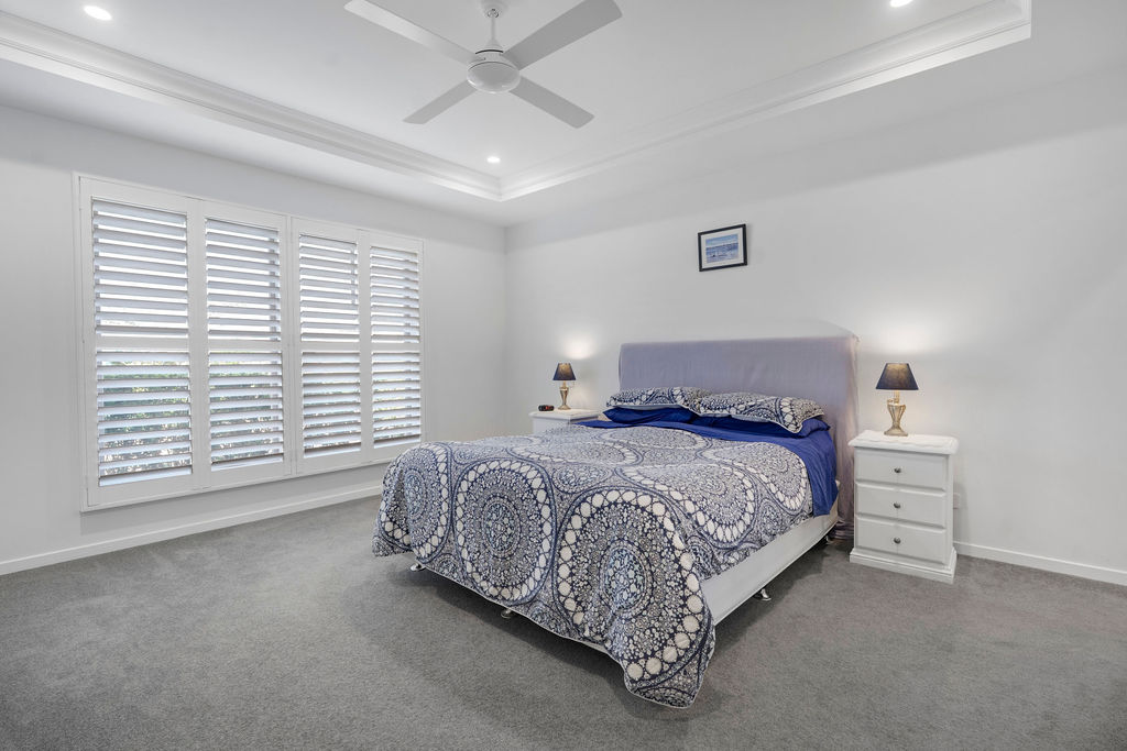 Positioned within Palm Lake Resort Beachmere Bay, the “Greenvale” home blends luxury with country charm on a private 476sqm corner block surrounded by lush gardens. Inside, wide hallways and a lightfilled layout maximise northern sunlight, complemented by high ceilings and Hamptons-inspired finishes.