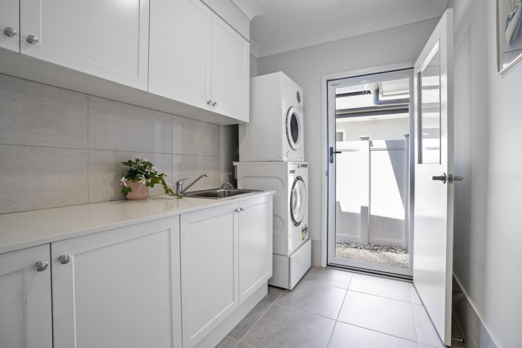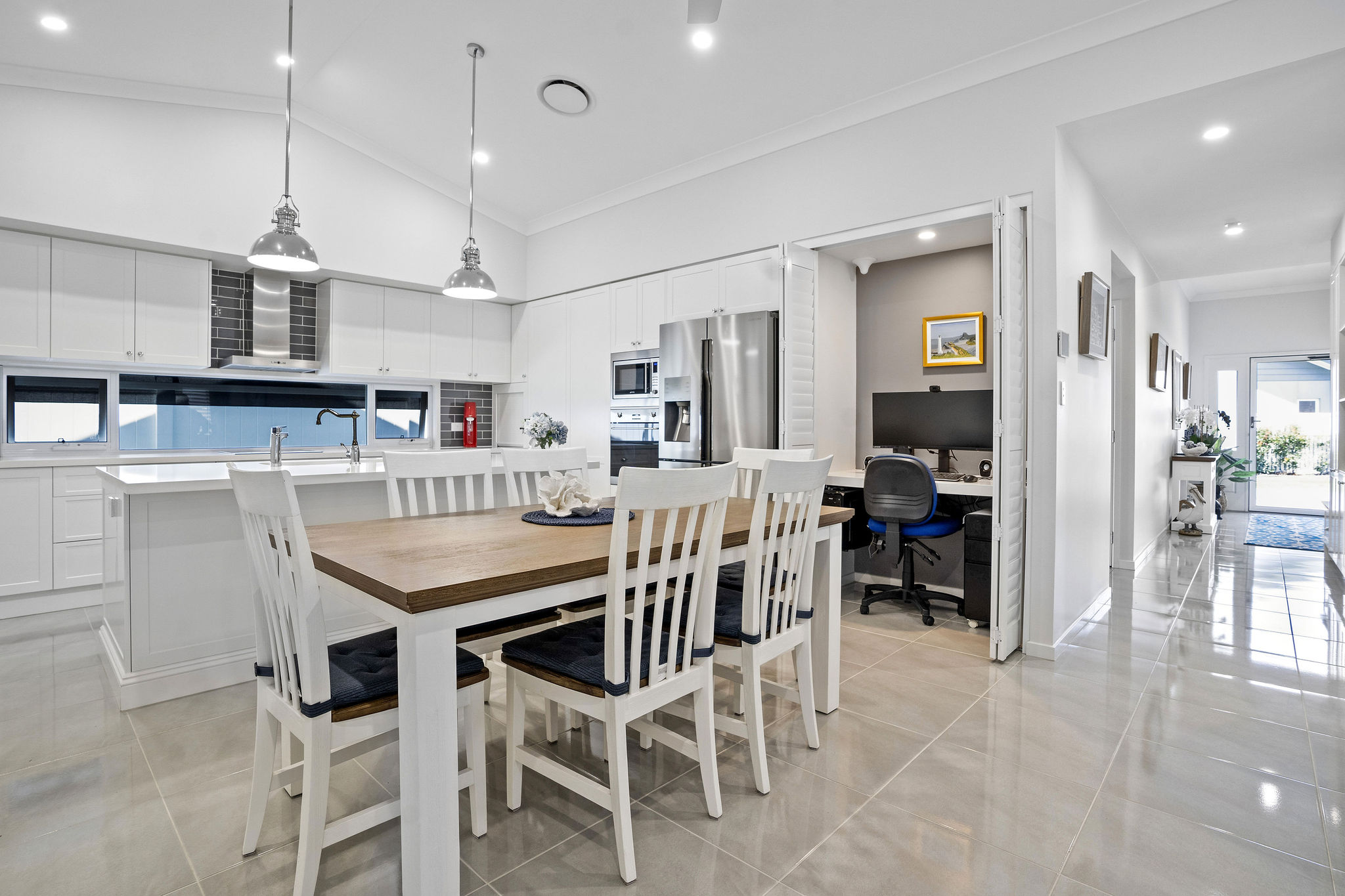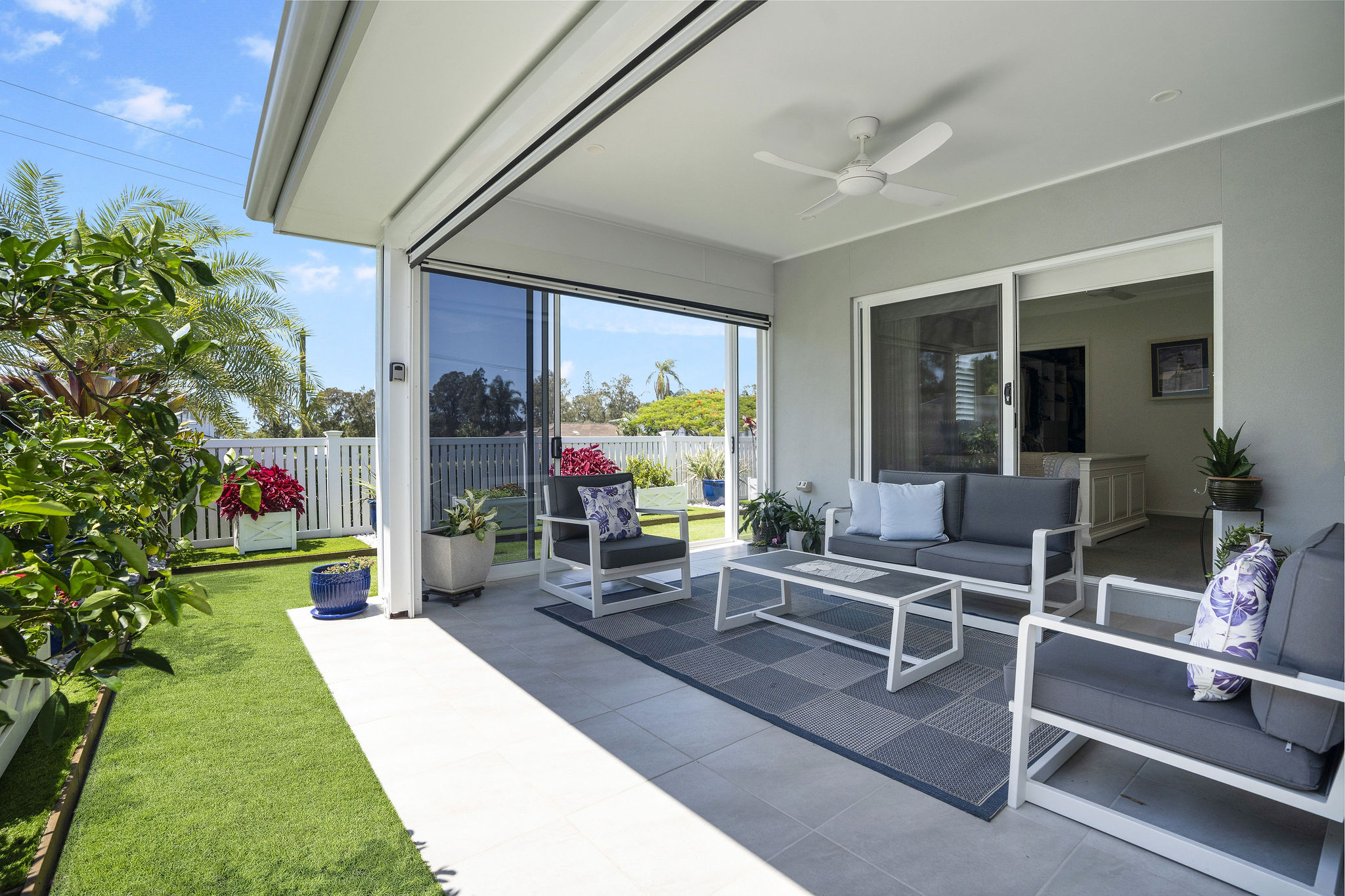 The kitchen features Smeg appliances, a large pantry with pull-out drawers and a Billi tap. Open-plan living flows to an east-facing alfresco with cyclone-proof stackable doors and electric blinds.