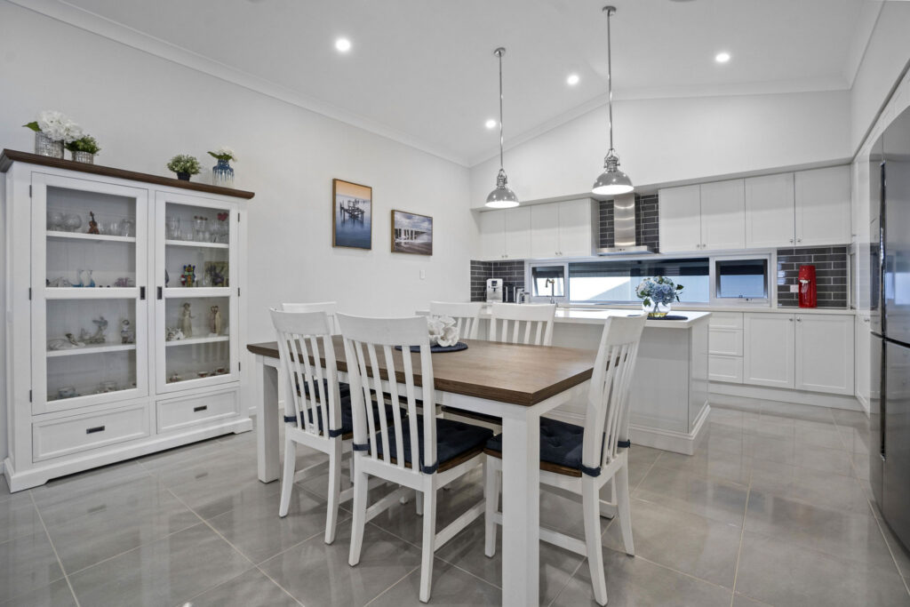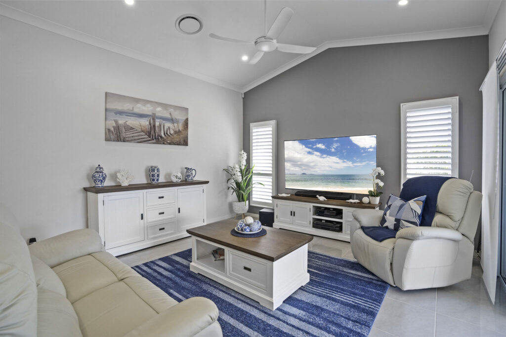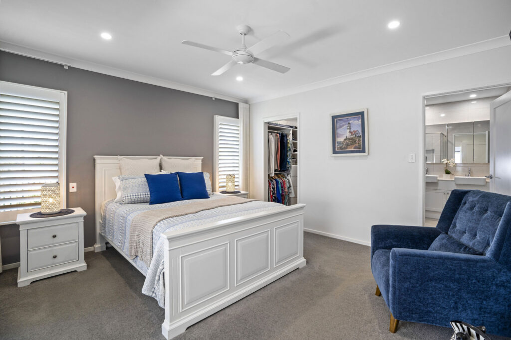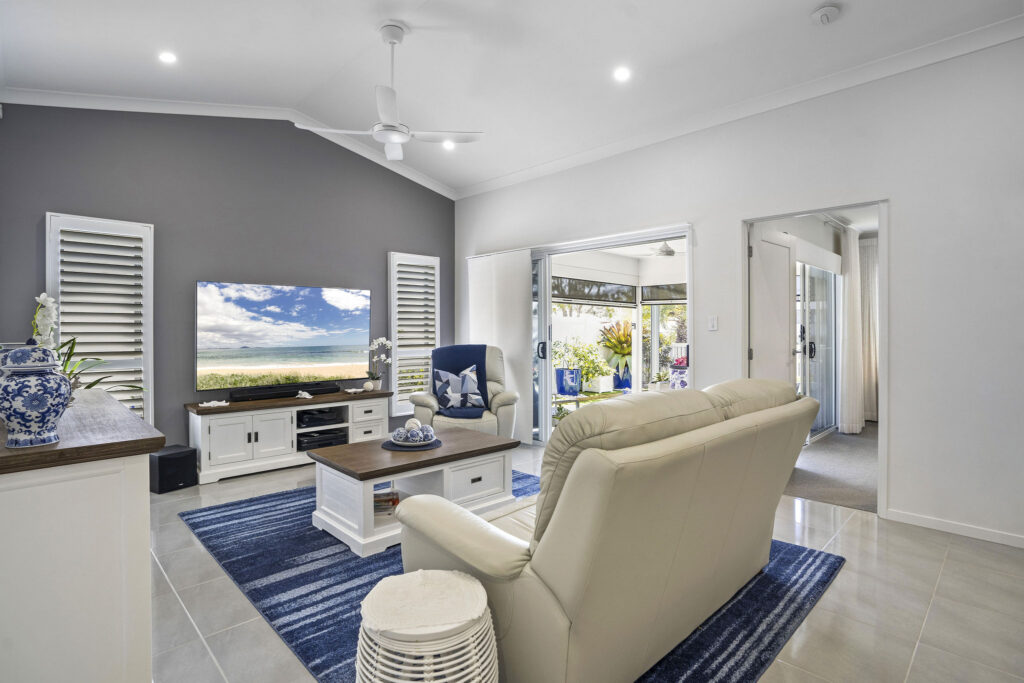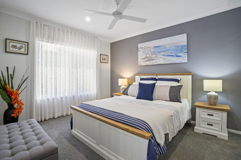 Nestled within a sought-after over-50s lifestyle resort, this Hamptons-inspired home offers three bedrooms, two bathrooms and a double garage. High ceilings, hybrid flooring and crisp white interiors enhance the bright north-facing layout.