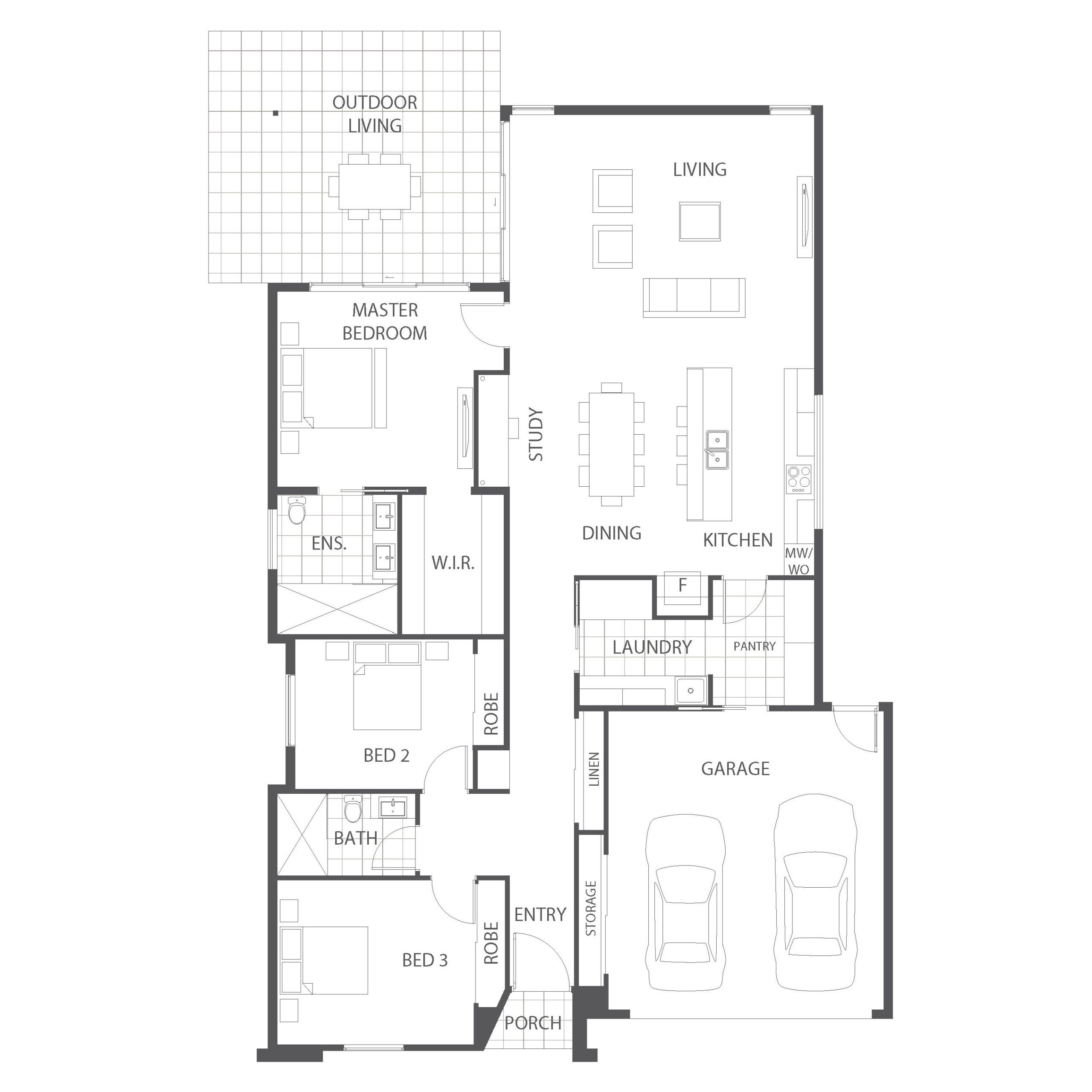 The master retreat, positioned at the rear for privacy, features a well-proportioned bedroom, large walk-in robe and luxurious twin-basin ensuite, with sliding doors opening to the tiled alfresco area. Two guest bedrooms at the front, each with built-in storage, are positioned near the main bathroom, with the added flexibility of a dedicated study nook. With a 216.6m² floor plan, smart storage and a flowing layout, the Mitchell blends practicality and style for over-50s seeking comfort and connection.
