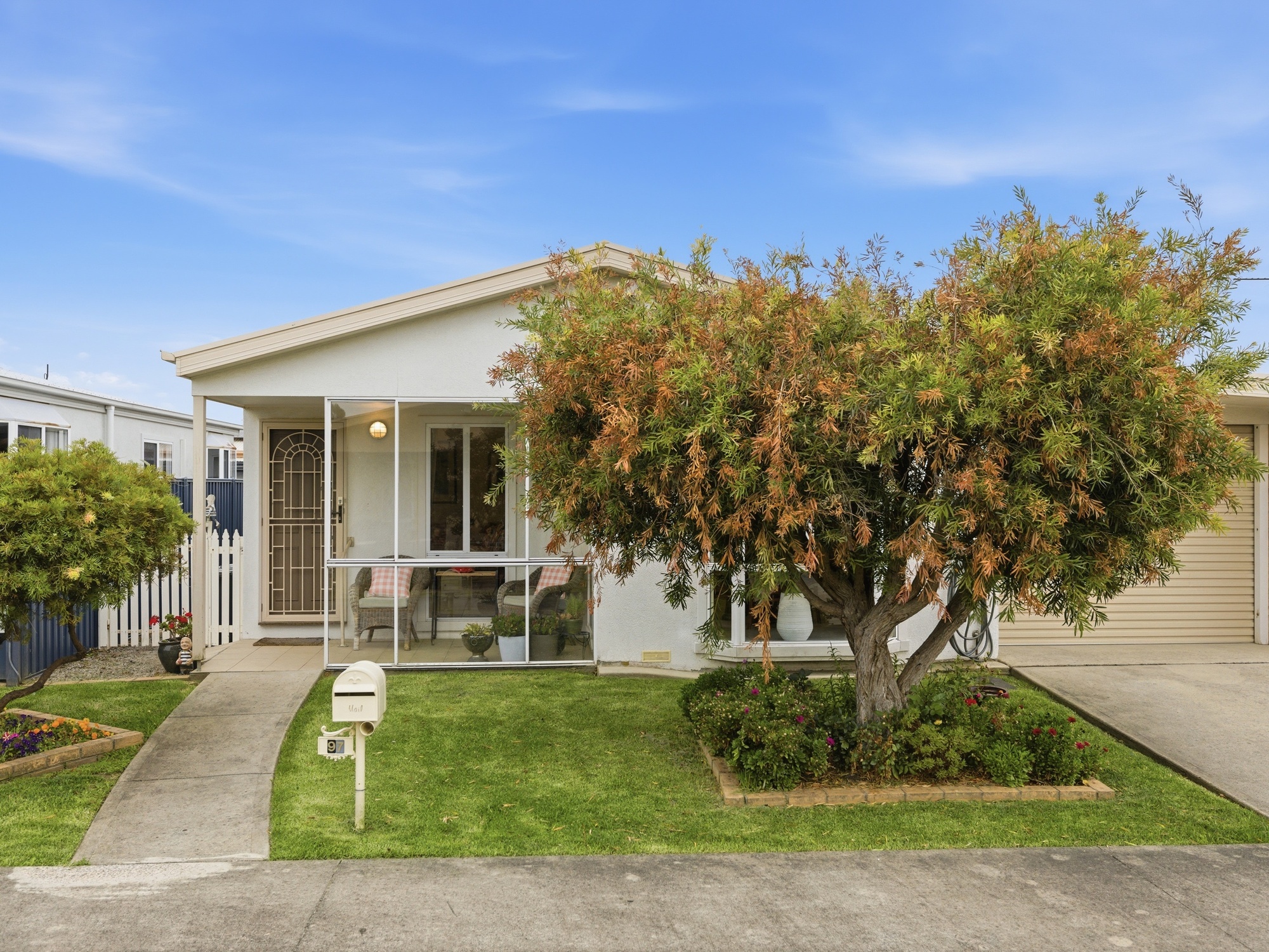 Featuring two bedrooms plus a study, all with built-in robes, and an ensuite-style bathroom with generous space, along with a second toilet for added practicality. Freshly painted interiors pair perfectly with near-new floor coverings, while stainless steel appliances enhance the modern kitchen. Enjoy year-round efficiency with solar panels, and relaxed outdoor living under the pergola. A large lock-up garage completes this easy-care package, ready for you to move in and enjoy.