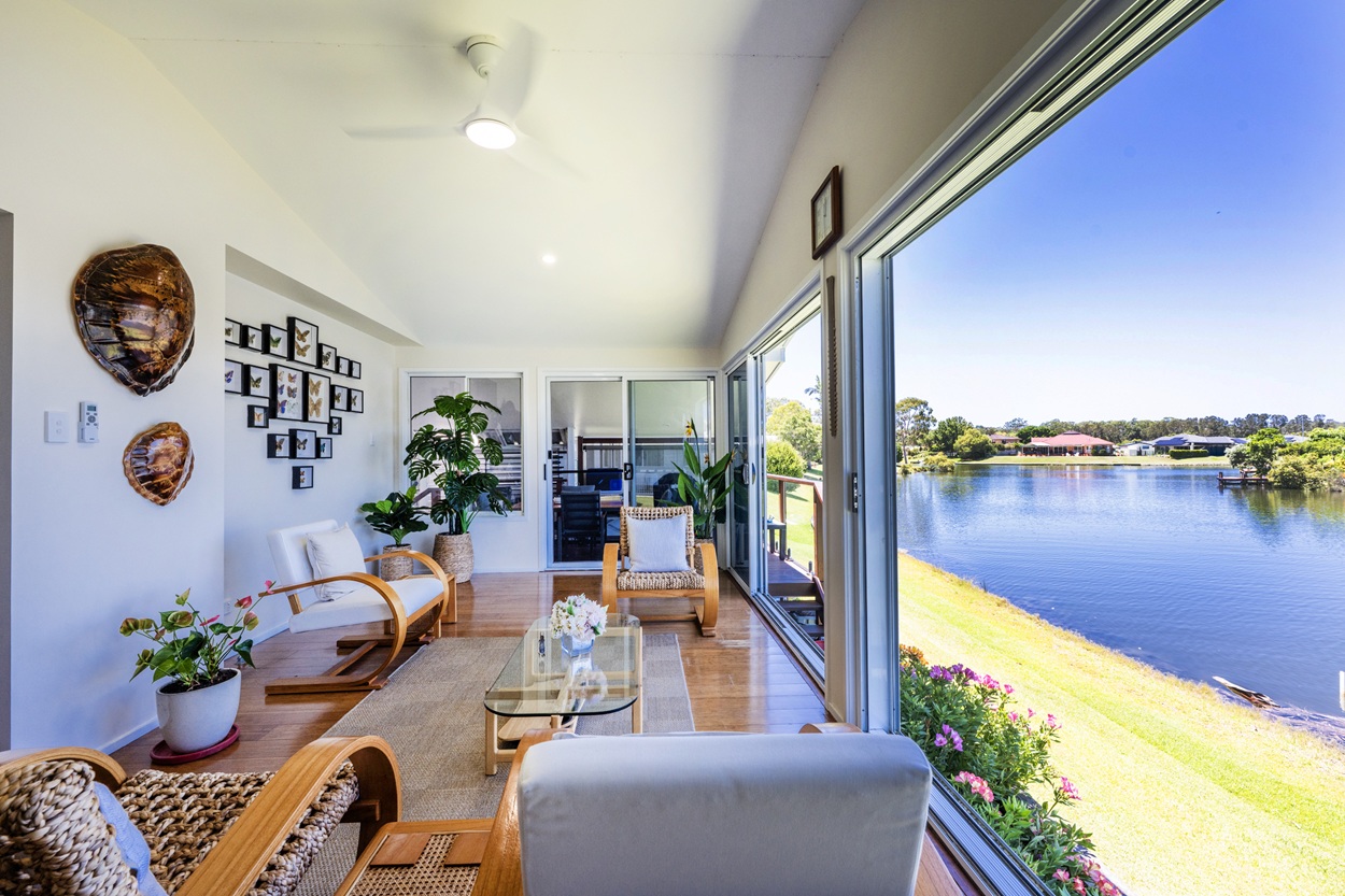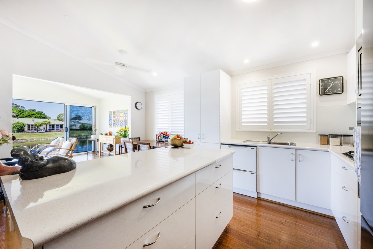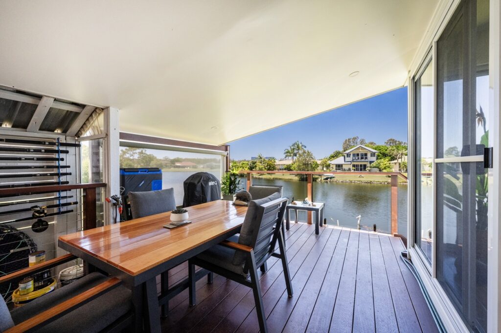Recently transformed to maximise breathtaking 180-degree water views, this beautifully renovated home delivers modern comfort with an enviable resort-style lifestyle. The sleek kitchen features a central island, new appliances and generous storage with soft-close cabinetry, flowing into open-plan living, dining and lounge spaces filled with natural light. A full-width sunroom connects seamlessly to the covered alfresco area and down to the water’s edge, perfect for entertaining.
