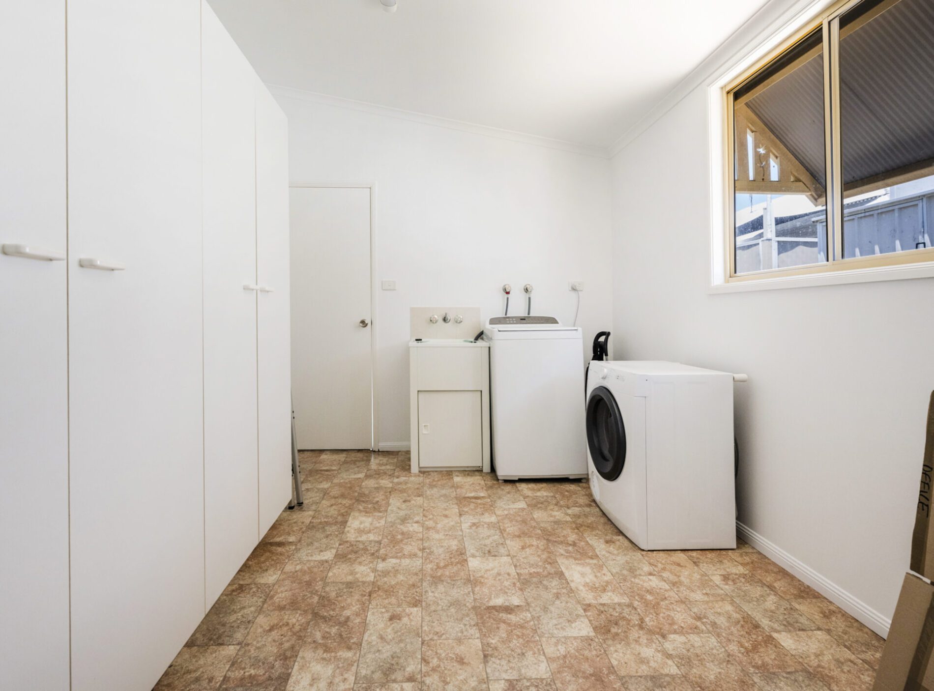 The master suite includes an ensuite and walk-in robe, while the second bedroom and multipurpose room/study add flexibility. A vaulted ceiling enhances the open-plan living area, creating a bright, welcoming space. A tandem garage and oversized laundry provide excellent storage, completing this inviting waterfront home.